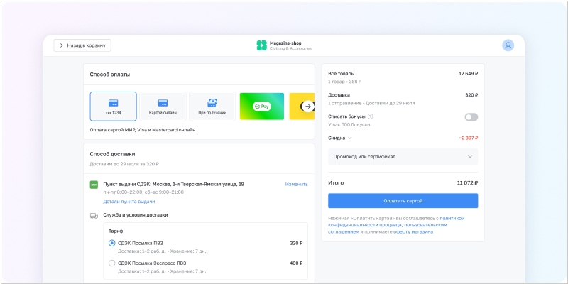 Популярный конструктор интернет магазинов InSales полностью переделал страничку чекаута, чтобы максимально упростить процесс оплаты. Появилась авторизация через СберID, оплата бонусами, удобное пошаговое оформление для новичков, мгновенное оформление для постоянных клиентов (информация подставляется автоматически), прозрачные условия доставки и оплаты, интуитивный поиск и выбор пунктов выдачи или адреса на карте, функция «Мои адреса» для сохранения избранных локаций, комментарии для курьера. Можно менять расположение блоков, управлять этапами оформления и множество других фишек. Также, в обновлении сервиса реализована поддержка счётчика СберТаргета, учет стоимости доставки в аналитике, автоответы на отзывы Wildberries.