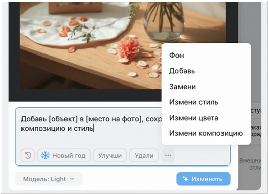 В VK Рекламе стало возможно редактировать изображение при создании объявления с помощью ИИ-инструментов. Рекламодатели могут самостоятельно добавлять или удалять объекты, менять фон и вносить другие визуальные изменения в креатив с помощью простых текстовых команд в рекламном кабинете. При создании картинки пользователь сможет выбрать функцию «Доработать с нейросетью». Далее в поле ввода нужно прописать пожелания по изменению изображения или же воспользоваться списком команд внизу поля. Например: «Улучши», «Удали», «Фон», «Замени» и другие. Весь набор команд доступен в выпадающем списке. Кроме того, рекламодатели смогут использовать готовый тематический промпт, чтобы преобразить свои креативы к актуальным сезонным событиям. Например, сейчас пользователям доступен промпт «Новый год».