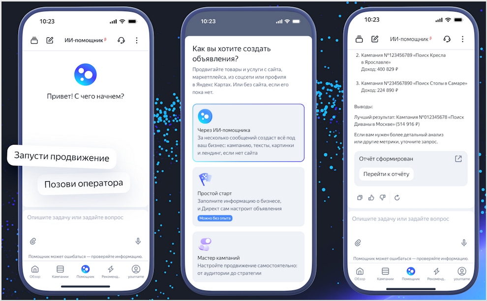 ИИ помощник появился в Яндекс Директе в конце 2025 и до сих пор он умел собирать аналитику по кампаниям, формировать отчет, а также отвечать на вопросы про статистику кампаний. Теперь он научился запускать рекламные кампании. Процесс запуска происходит через диалог в чате - помощник задает вопросы о специфике бизнеса, предлагает стратегию и параметры продвижения (которые можно одобрить или отклонить), выбирает оптимальные варианты бюджета для этих параметров, создает тексты и изображения под аудиторию, при необходимости генерирует лендинги и помогает с настройками. Перед запуском ИИ-помощник согласовывает ключевые параметры кампании и бюджет. В Яндексе говорят, что таким образом не только упрощается процесс старта рекламы (не нужно разбираться в настройках), но и эффективность повышается на целых 30%.