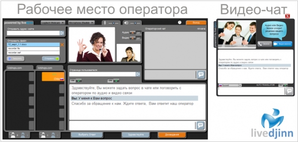В рунете появился еще один онлайн консультант для сайтов – Livedjinn. Этот сервис предоставляет довольно много инструментов для эффективного общения с посетителями сайта: мониторинг нахождения посетителя на странице, определение его страны/города, хранение истории посетителя, шаблоны ответов, автоответчик, открытие оператором любых веб страниц на стороне пользователя, переадресация чата и т.д. Но главная особенность Livedjinn - это возможность автоматического перевода диалогов с 15-ти языков в любом направлении. Кроме текстового чата сервис поддерживает и аудио/видео чат. Систему онлайн-консультирования Livedjinn можно установить на нескольких сайтах и подключать до 10 операторов одновременно. Вы также можете самостоятельно настроить интерфейс своего чата. Стоимость сервиса - от 390 рублей в месяц