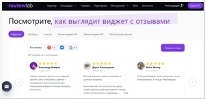 ReviewLab - это виджет, который автоматически собирает отзывы о компании с разных площадок (Яндекс.Карт, 2ГИС, Google Maps, VK, Авито, Яндекс.Бизнес, Zoon, Otzovik, ПроДокторов и др.) и отображает их в едином блоке на вашем сайте, повышая доверие клиентов и увеличивая конверсию за счет демонстрации реальных мнений из проверенных источников. С помощью AI-инструментов сервис определяет тональность отзывов и показывает только положительные (или можно настроить фильтрацию отзывов по рейтингу). В нем есть гибкий редактор дизайна для индивидуальной настройки виджетов. Стоимость ReviewLab начинается от 207 руб в месяц